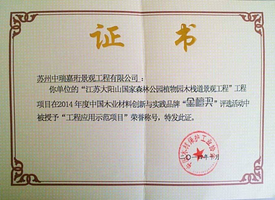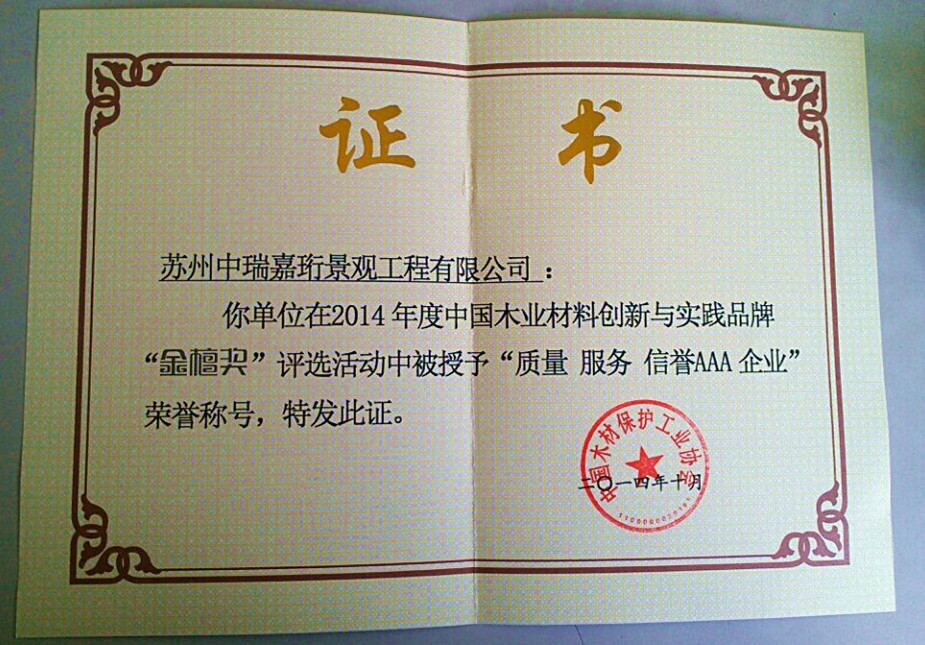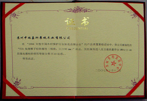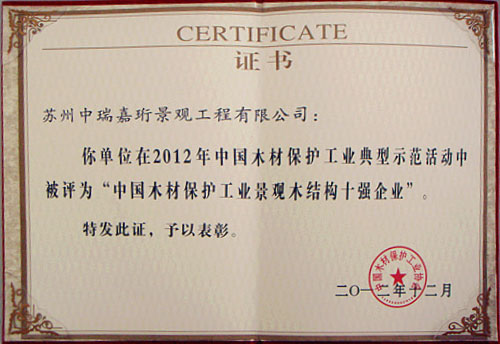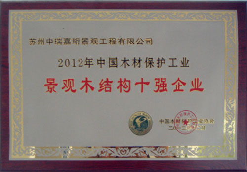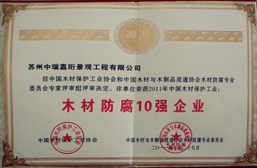 2013年在《中國木材保護工業協會》的組織下,我公司榮獲本年度防腐木企業評選《防腐木材企業十強》稱號。