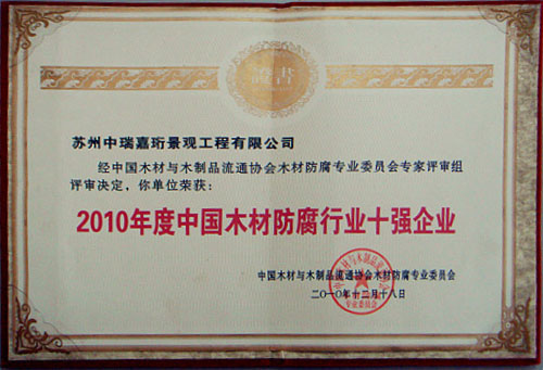2010木材防腐行業十強企業證書